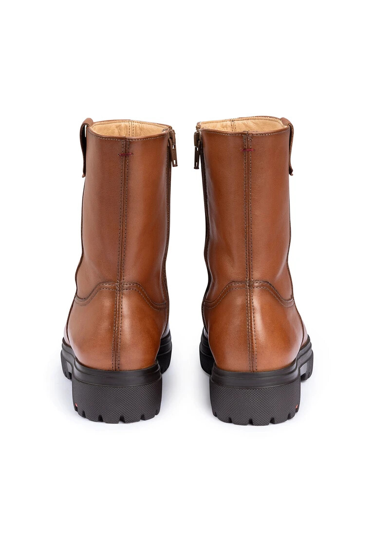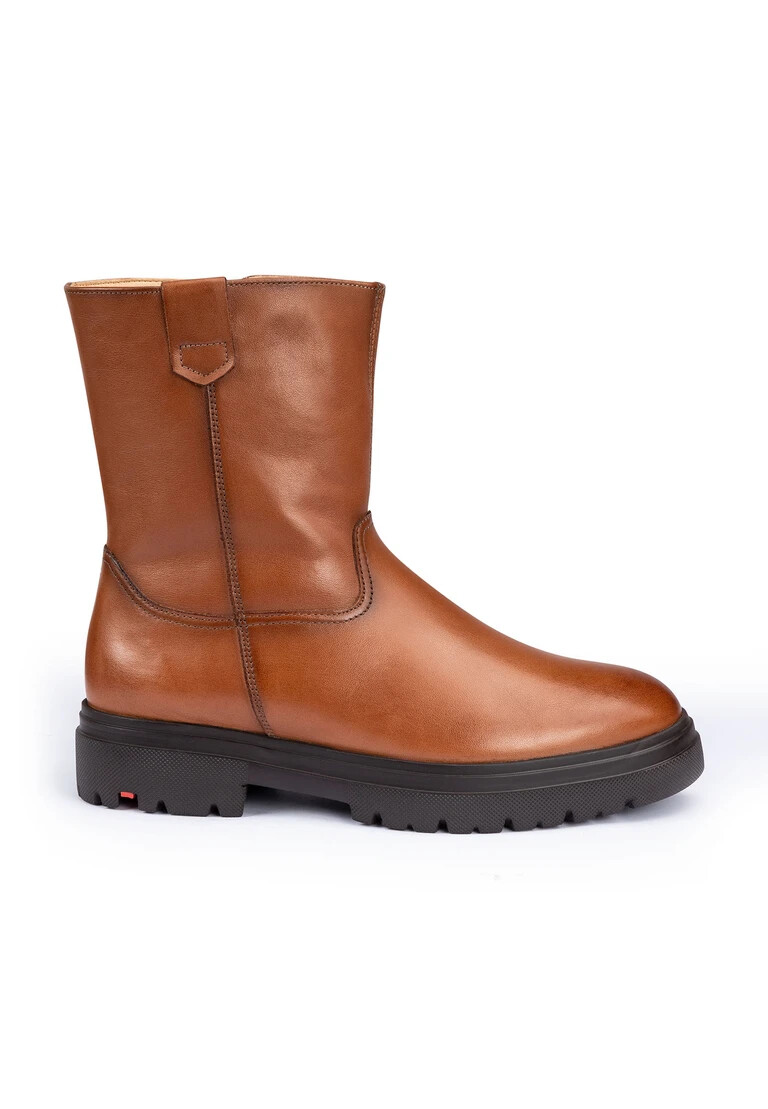 The LLOYD boot in brown smooth leather impresses with its extremely lightweight and shock-absorbing sole. The boot creates a versatile look that can be combined with many different styles. The abrasion-resistant rubber sole provides ideal cushioning when walking, while the lambskin insole offers a warm interior. Thanks to the flat block heel, the boot offers a secure stance and is particularly suitable for everyday wear. The zipper and soft, smooth leather ensure an elegant look and easy fastening. The lambskin-lined boots are temperature-regulating and keep feet warm even on colder days.