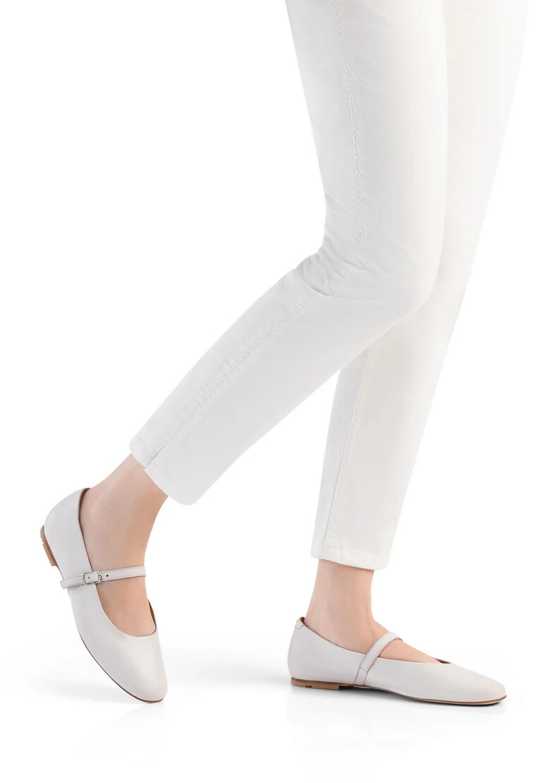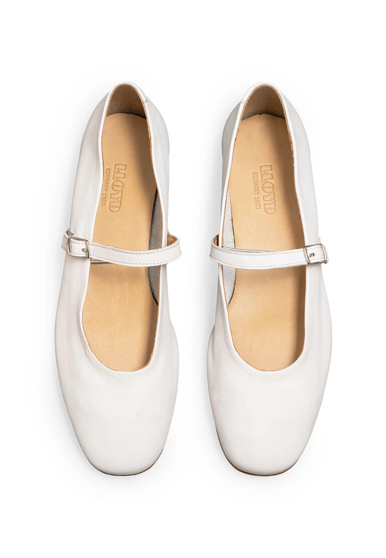 Catch the eye with the LLOYD ballerina made from white smooth leather and a classic design. The shoes are ideal for a stylish and feminine look. A wear-resistant leather and rubber sole cushions the impact when walking and guarantees comfortable long wear and the leather of the inner sole contributes to good heat regulation. Through the low block heel the shoes offer secure footing and allow comfortable daily wear. Quick putting on and taking off as well as a classic, elegant appearance are ensured with the soft smooth leather upper, the elasticated band and buckle fastening. These leather and textile lined shoes are comfortable and breathable.
