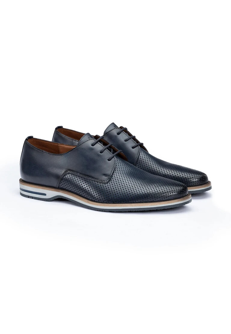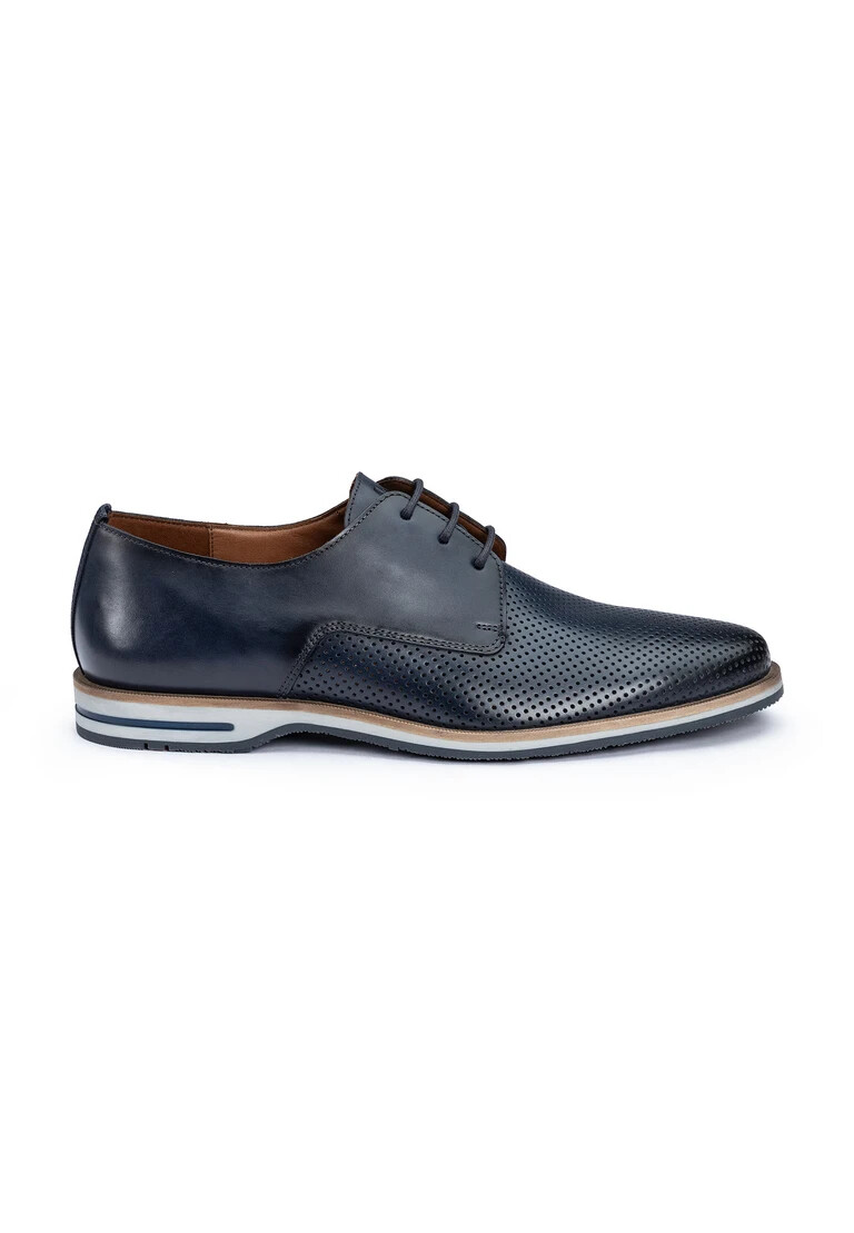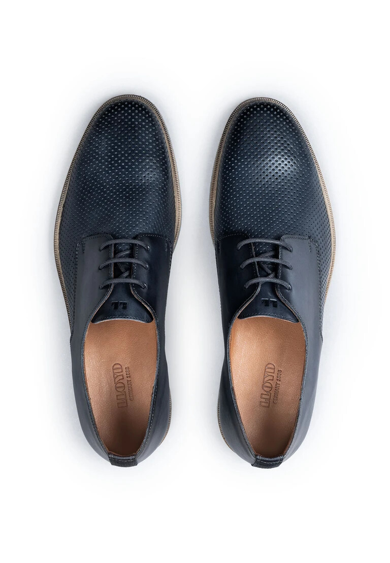 The LLOYD DEMOND derby shoe combines timeless design with modern comfort and is perfect for everyday business. Made from elegant smooth leather and embossed leather, it offers an elegant look in classic blue. The rubber sole ensures optimum slip resistance and long-lasting use, while the comfortable leather insole guarantees a pleasant feel. With the classic lacing, the shoe ensures a perfect fit and withstands every step. The high-quality lining made of 60% leather and 40% synthetic supports breathability without having to resort to a warm lining. The round toe and stylish look make the DEMOND the ideal choice for fashion-conscious men. Treat yourself to this versatile companion for your business occasions.