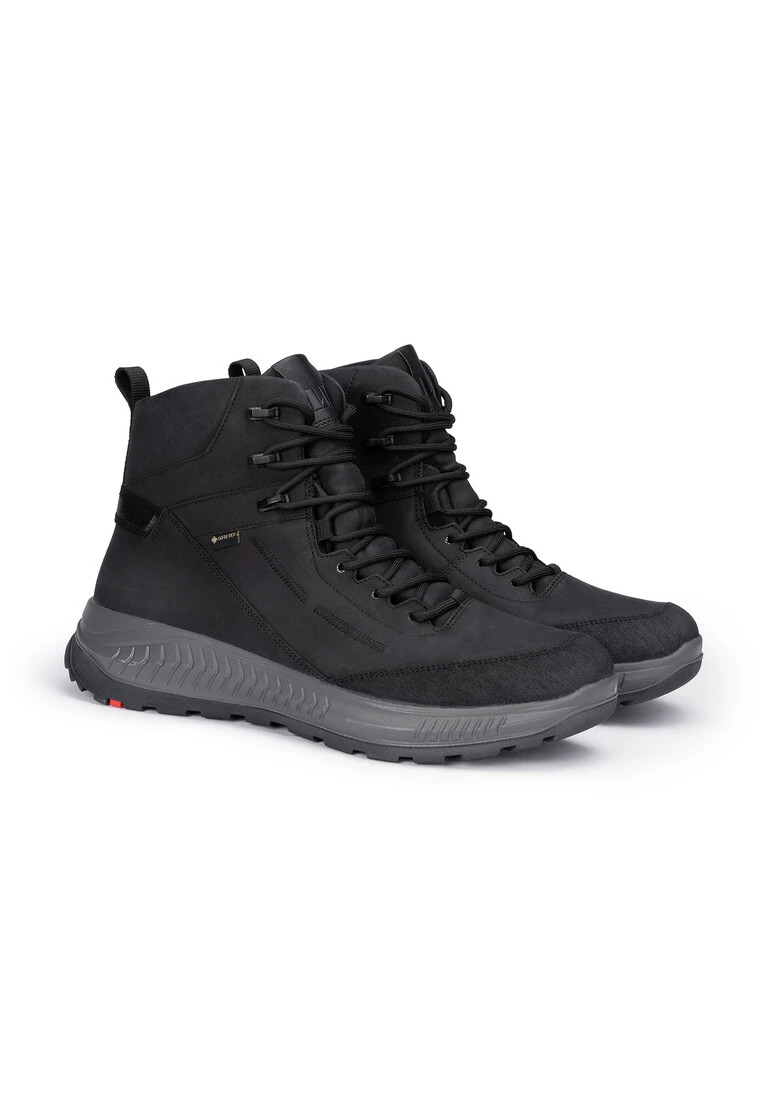 The LLOYD lace-up shoes designed with black rough leather feature an all around waterproof and extremely breathable GORE-TEX membrane suited for any weather. In these men’s lace-up shoes, a secure fit through lace fastening is a given. The wear-resistant rubber sole cushions the impact when walking perfectly. On top of that, the synthetic of the inner sole provides lightness in wear. A firm, secure grip as well as a modern, high-quality look are guaranteed by the stylish leather upper and the laces. By use of the wool lining these shoes are insulated and warm and also snug during cold days. With the GORE-TEX technology, the model is temperated comfortably guaranteeing a pleasant foot climate.