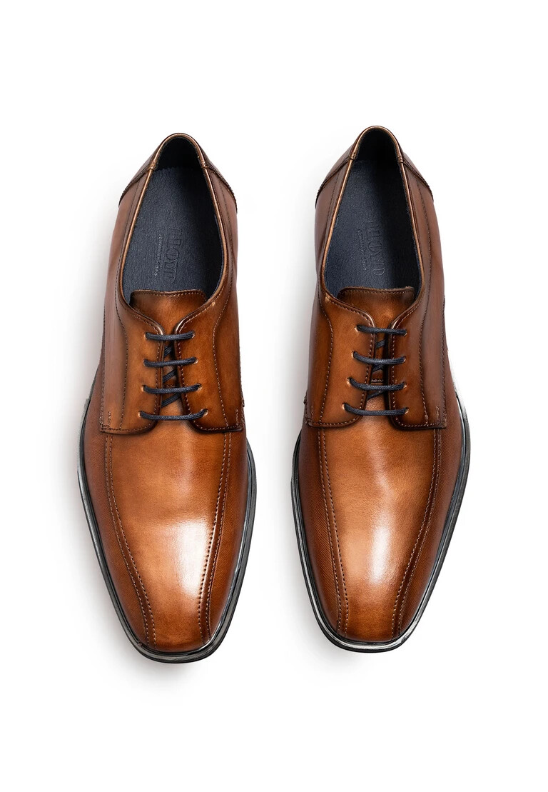 Stand out with the LLOYD derby shoes “GEORGE” made from brown smooth leather and a fashionable design. A secure fit through lace fastening is guaranteed in these shoes. Their wear-resistant rubber sole cushions the impact when walking perfectly. On top of that, the onSteam/Leder of the inner sole provides optimal heat regulation. The elegant, squared toe gives a timeless shape to the feet. A firm, secure grip as well as a modern, high-quality appearance are ensured by the stylish leather upper and the laces. These shoes are comfortable and breathable by use of the leather and textile lining.