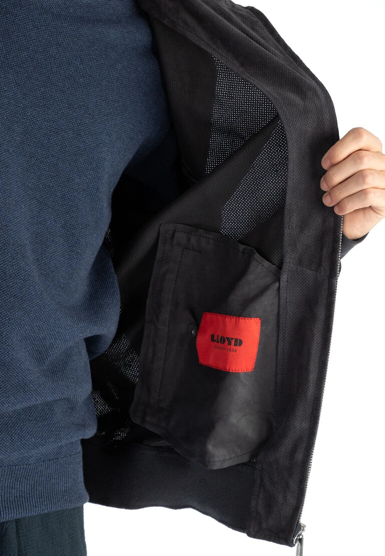 The lightweight “THEO” leather jacket from LLOYD combines stylish design with first-class comfort. Made from the finest goat suede, which is particularly breathable thanks to micro perforation, this jacket has a supple feel. The unlined material is light as a feather, making it ideal for warmer days. A robust metal zipper and a fashionable stand-up collar complete the elegant look. Two welt pockets and two inside pockets, which are ideal for safely storing small items, offer additional practical benefits. Elastic and flexible ribbed cuffs on the sleeves and hem ensure a perfect fit. This leather jacket is an outstanding example of LLOYD’s commitment to quality and style.