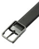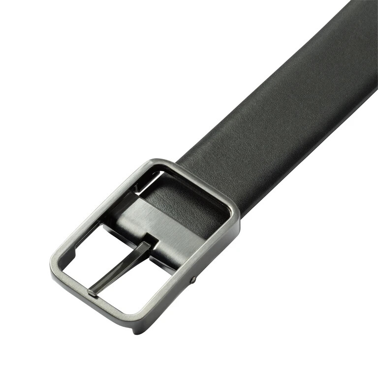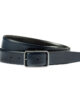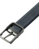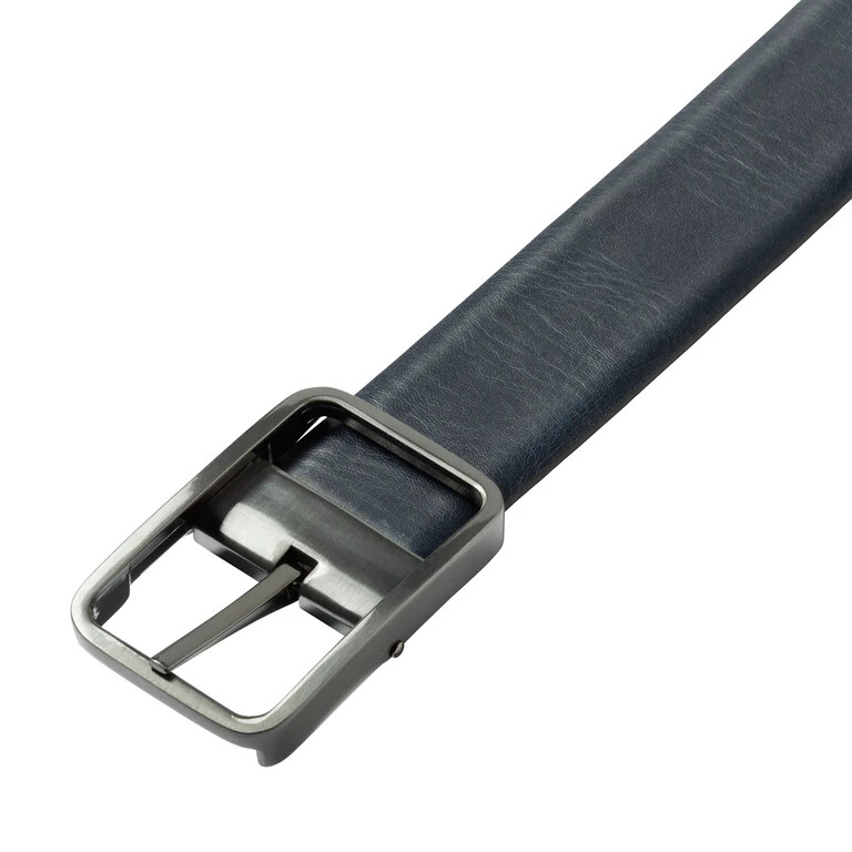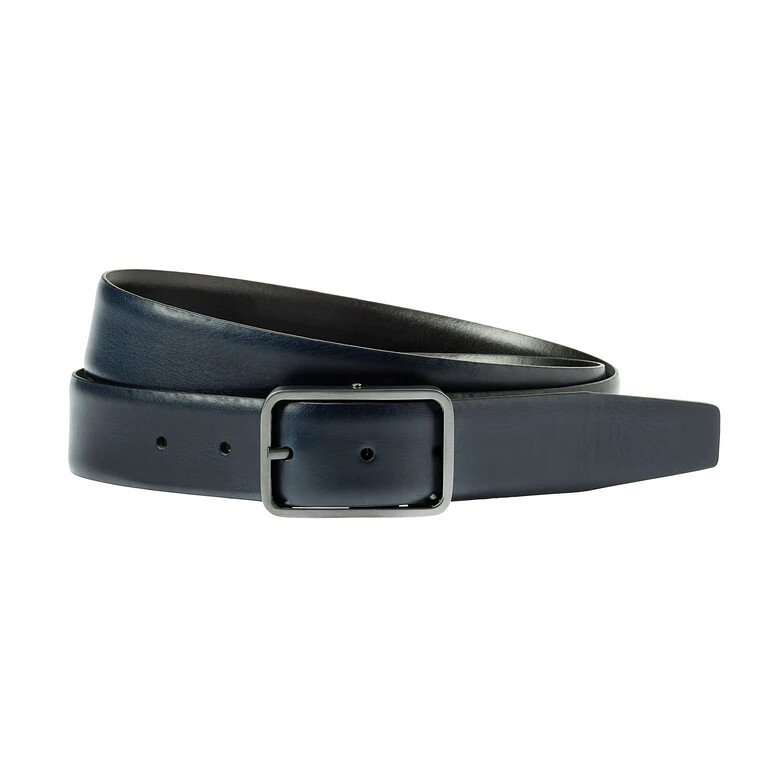 Reversible belt with bar buckle that can be worn on both sides. Either the blue or the black side is visible.