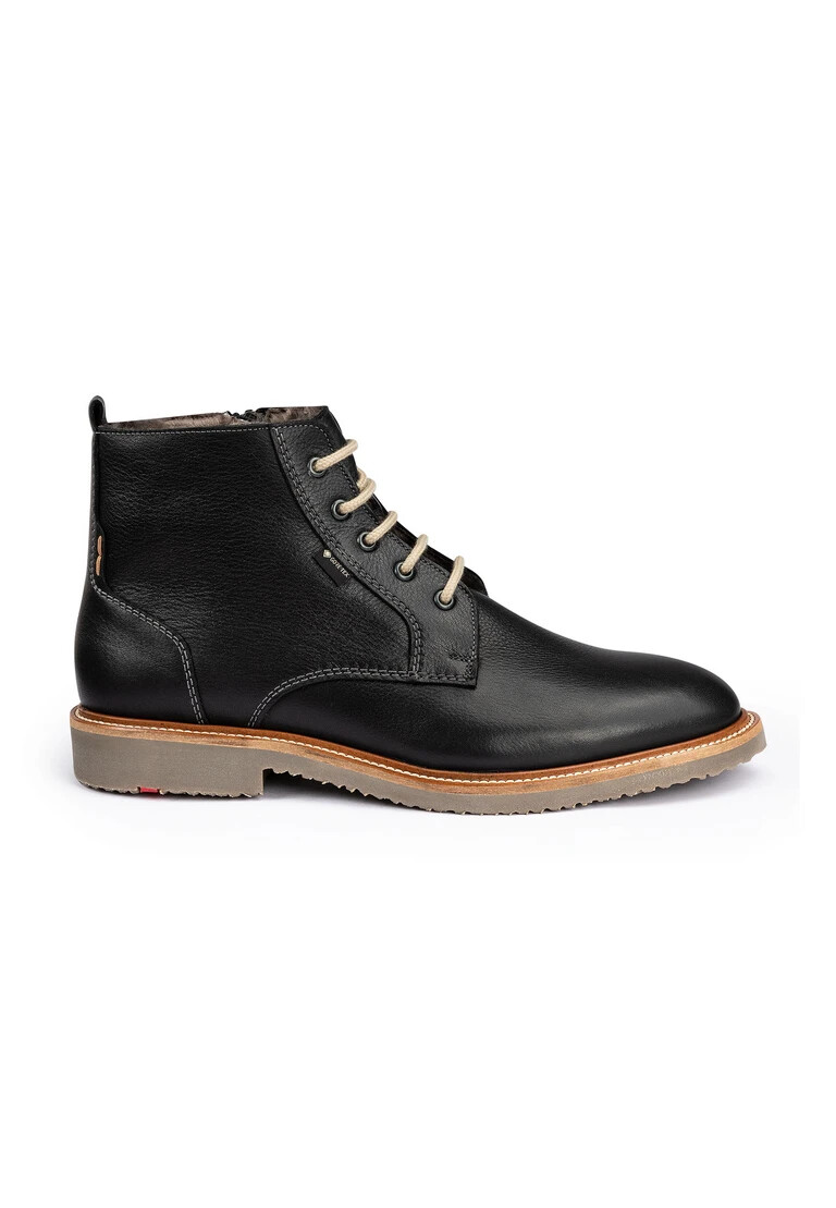The LLOYD boot made of black leather impresses with its permanently waterproof and breathable GORE-TEX membrane, whatever the weather. Thanks to the lacing, the lace-up shoes promise a secure fit. The abrasion-resistant rubber sole provides ideal cushioning when walking, while the lambskin insole offers a warm interior. Thanks to the flat block heel, the boot offers a secure foothold for everyday wear. The zipper and the hard-wearing, grained leather ensure a very individual, high-quality look and easy closure. Even on colder days, the lace-up boots keep you warm and are also temperature-regulating thanks to the lambskin lining.